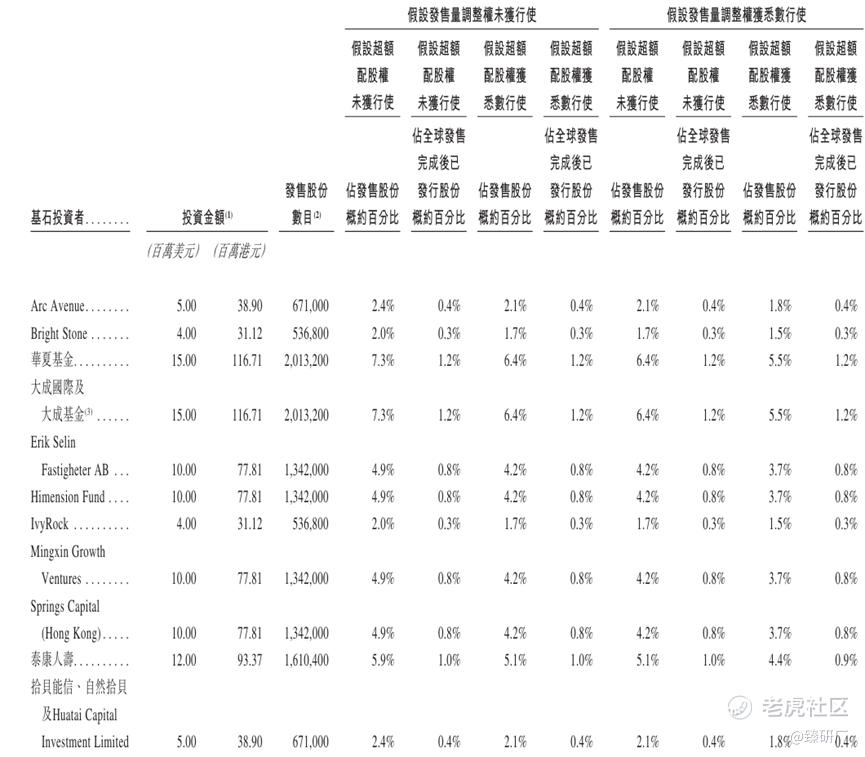 共11名基石投资者:新加坡金管局、Bright Stone、华夏基金、大成基金、Erik Selin Fastigheter AB、Himension Capital、IvyRock基金、名信成长基金、泰康人寿、Springs Capital及拾贝投资的华泰场外掉期,合计认购约1亿美元,按发售价57.97港元计算,相当于此次全球发售股份的48.8%及紧随全球发售完成后已发行总股份的8.3%。