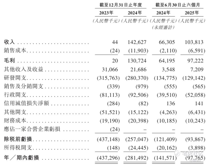 2023年至2025年H1,瑞博生物的营收分别为人民币4.4万元、1.43亿元、1.04亿元,2025年H1同比增长56.6%。公司目前尚无已商业化产品,收入主要来自于对外授权合作的首付款和里程碑付款,2024年及2025年H1收入占比分别为67.0%、58.2%。