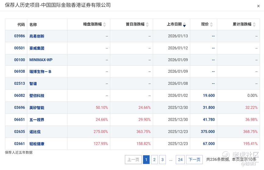 中金公司历史上作为保荐人参与了228个项目,其中暗盘有105家公司上涨,97家公司下跌,26家公司平盘,破发率42.54%。首日有110家公司上涨,88家公司下跌,30家公司平盘,破发率38.60%,整体胜率一般。今年以来参与保荐了41个项目,其中有14家公司暗盘或首日破发,有13家公司录得累计跌幅,体现中金近一年来参与保荐的项目素质较过往明显提高。但是12月以来的项目因为市场情绪的变化而破发与大涨互现,波动较大。