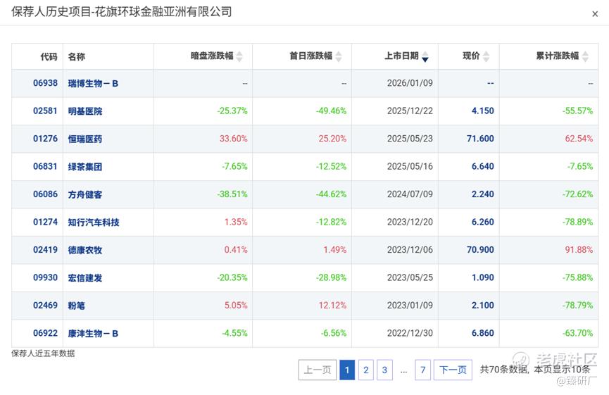 花旗历史上作为保荐人参与了68个项目,其中暗盘有31家公司上涨,18家公司下跌,19家公司平盘,破发率26.47%。但是首日破发率却飙升到45.59%,护盘能力一般,整体胜率不高。今年以来仅参与保荐了3个项目,只有恒瑞医药没有破发、累计涨幅为正,明基医院和绿茶集团均表现不佳。