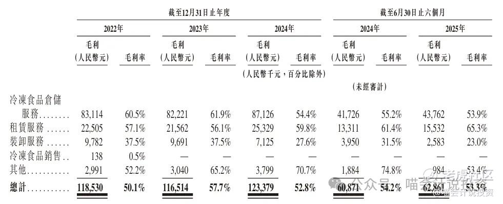 冷冻食品仓储服务毛利率在下降,整体毛利率基本持平,在53%左右。