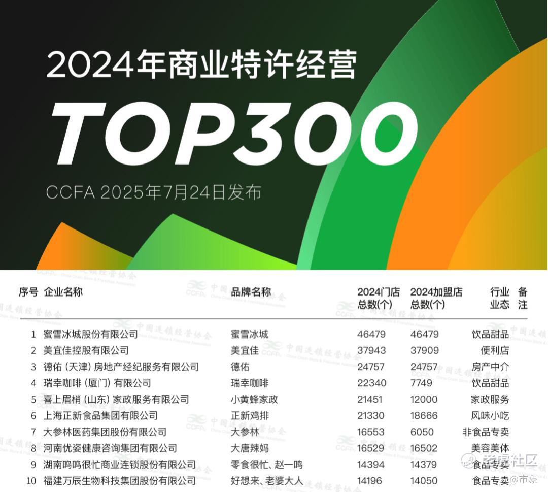 中国连锁经营协会(CCFA)发布的《2024年商业特许经营TOP300》报告显示:TOP300企业门店总数达83万家;其中TOP280企业门店数82.5万家,同比增长30.73%;万店级品牌数量从9家翻倍至18家。