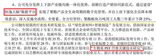 技术投入方面,恒逸以“恒逸大脑”推动智能制造,聚酯板块万人用工三年下降25%,显著降低人工成本;新凤鸣则更注重材料创新,已获批“生物基PEF纤维关键技术”等省级重点研发项目,并与东华大学共建联合实验室。前者提升效率,后者拓展边界,都是好方向,但后者更可能在未来打开第二增长曲线。