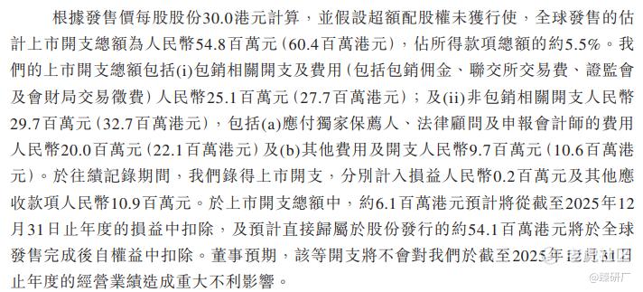 按发售价30.00港元计算,公司上市总支出预计约为0.60亿港元、约占所得款项总额的5.5%(假设未行使超额配售权)。约610万港元预计将从截至2025年12月31日止年度的损益中扣除,及预计直接归属于股份发行的约0.54亿港元将于全球发售完成后自权益中扣除。