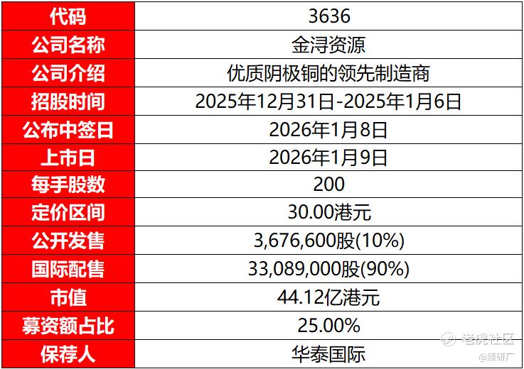 从市场情绪方面来看,截至发稿,金浔资源的公配超购2.85倍,同期共有6只新股同步招股,分别为兆易创新、BBSB、红星冷链、豪威集团、MINIMAX及瑞博生物,其中MINIMAX已超购21.89倍。值得注意的是,金浔资源的申购资金解冻后,投资者仍可参与红星冷链、兆易创新及BBSB的申购,三者招股日期无冲突,资金可灵活调配。此外,与金浔资源发售日期仅相差一天的还有精峰医疗、智谱及天数智芯3只新股正在招股,其中智谱超购热度显著,已达82.14倍。这3只新股的招股日期与金浔资源存在重叠,解冻后将错过金浔资源的申购日期,可能导致部分资金分流。不过,随着后续市场增量资金进场,预计金浔资源的孖展倍数有望在未来几日逐步上升,感兴趣的投资者可重点关注后续申购动态。