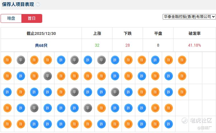 华泰国际历史上作为保荐人共参与68个项目,暗盘36家公司上涨,29家公司下跌,3家公司平盘,破发率为42.65%;上市首日32家公司上涨,28家公司下跌,8家公司平盘,破发率41.18%。