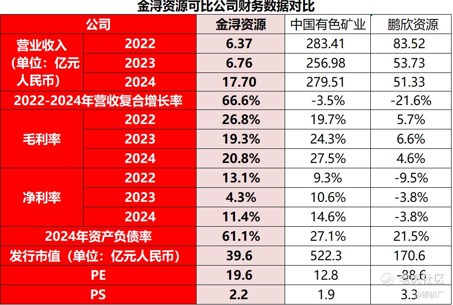 金浔资源2022-2024年营收分别为6.37亿元、6.76亿元、17.70亿元,与中国有色矿业(同期283.41亿元、256.98亿元、279.51亿元)、鹏欣资源(83.52亿元、53.73亿元、51.33亿元)相比,营收规模目前仍处于相对低位,但在营收复合增长率方面,金浔资源达到66.6%,大幅高于中国有色矿业的-3.5%与鹏欣资源的-21.6%,展现出极强的增长动能。金浔资源以非洲铜钴产区“加工-冶炼-交易”一体化布局为核心方向,叠加现有设施技术升级与产能逐步释放的布局,为营收持续扩张奠定基础;中国有色矿业作为非洲铜钴领域的成熟企业,营收波动或源于全球铜价周期及产区项目阶段性调整;鹏欣资源则因业务多元布局(含黄金、金融等非矿板块)的结构优化,导致铜钴相关营收阶段性收缩。