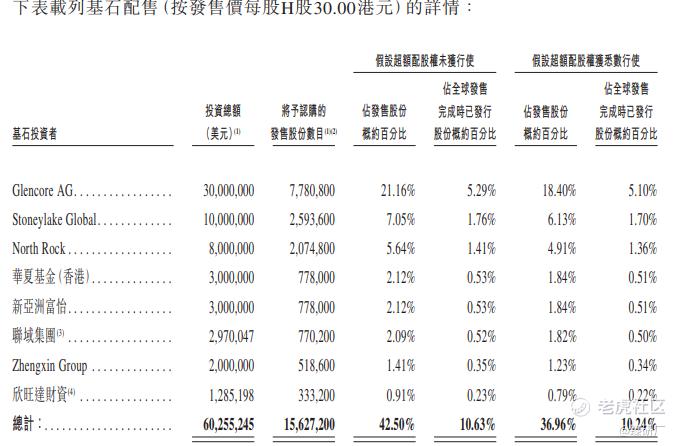 本次发行拥有8名基石投资者,分别为Glencore AG、Stoneylake Global、North Rock、华夏基金(香港)、新亚洲富怡、联域集团、Zhengxin Group及欣旺达财资合计认购0.60亿美元,按发售价每股30港元,基石投资者认购的发售股份总数为15,627,200股,约占根据全球发售发行的发售股份的42.50%,(假设超额配股权未获行使)。