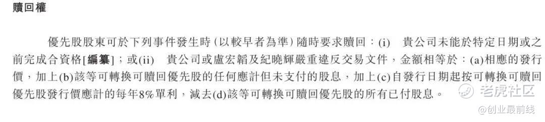 值得注意的是,公司与投资机构签署了对赌协议,如果公司未按期完成合格上市、公司或核心创始人卢宏韬、纪晓辉严重违反交易文件等,若触发以上情形,优先股股东有权要求赎回股份,代价是优先股发行价叠加发行价年化8%的利息。