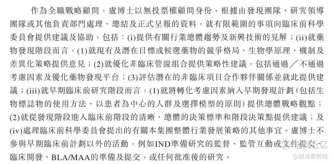 作为全职战略顾问,卢宏韬以无投票权顾问身份,就有限范围事项向临床前科学委员会提供建议及协助。