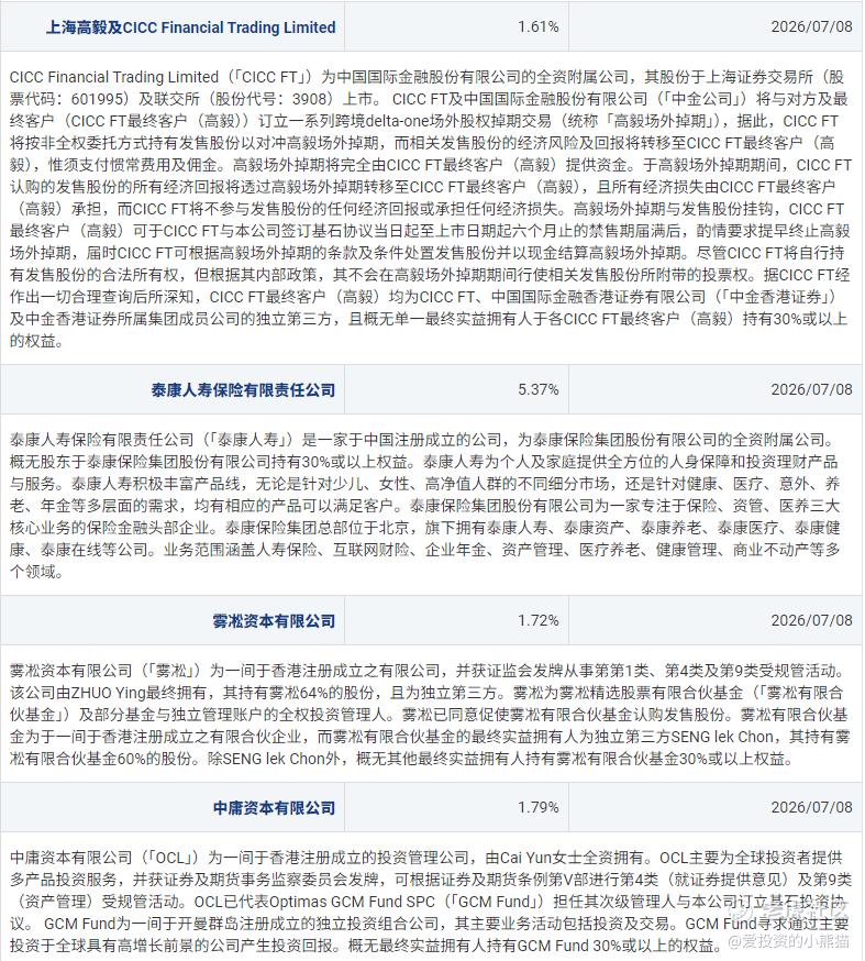 1. 基石投资者名单:包括JSC International Investment Fund SPC、Perseverance Asset Management (Singapore) Pte.Ltd.、WT Asset Management Limited、广发基金、泰康人寿、上海高毅及CICC Financial Trading Limited等11家机构,涵盖国际投资基金、国内头部公募/保险/私募、产业资本等类型。