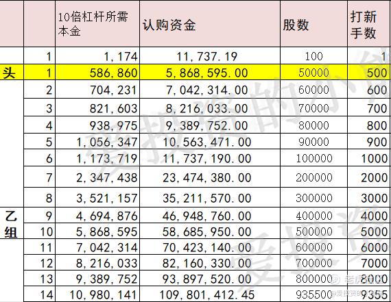 乙头需要认购资金587万,乙组的各档融资所需要的本金还有融资金额对应如下表: