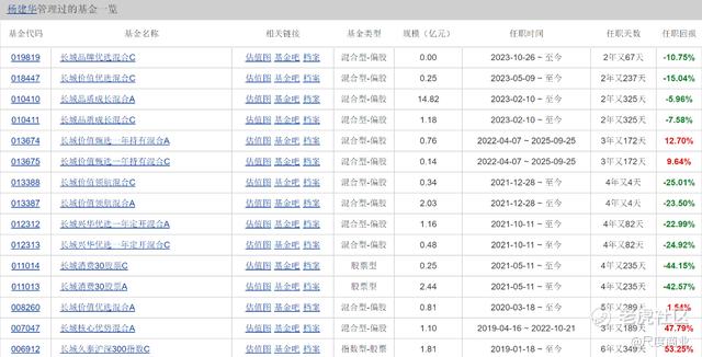 杨建华目前在管7只基金(多种份额合并计算),其中,长城品牌优选混合管理超过12年,也是管理业绩最好的,任职回报超过100%。而7只产品中有4只任职回报负收益,负收益产品中3只管理时长超过4年,最高亏超过40%。