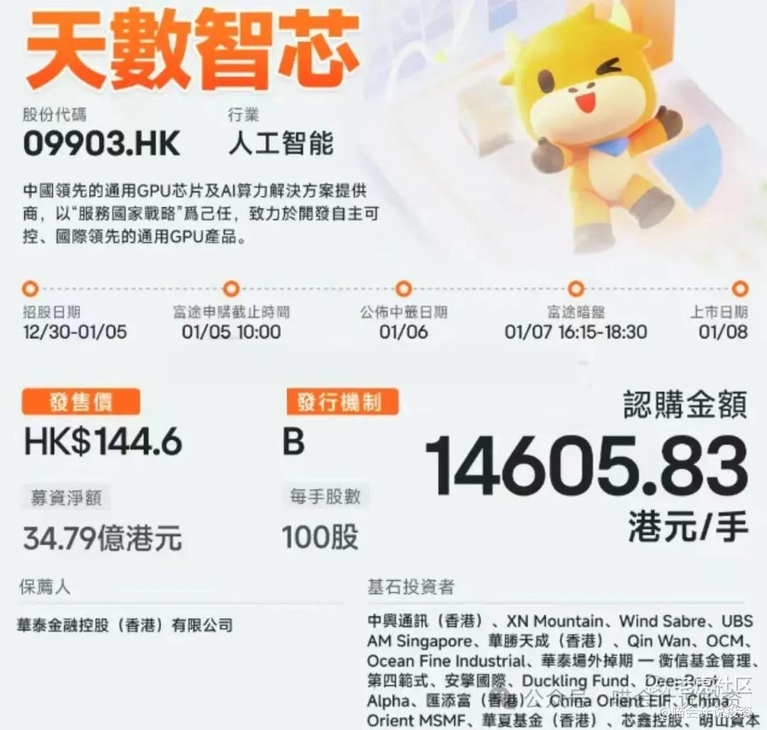12月30日,天数智芯(09903.HK)正式启动香港招股,招股日期至2026年1月5日,拟全球发售2543.18万股H股,每股招股价144.60港元,每手买卖单位100股,预期将于2026年1月8日在港交所主板上市。