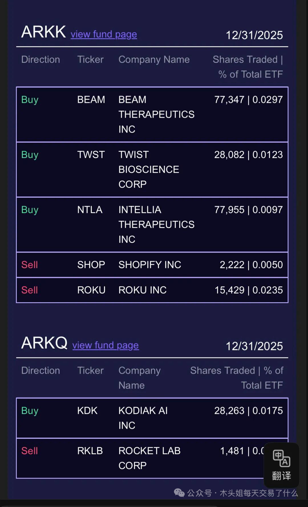 木头姐今天买入80万美元NTLA 卖出150万美元ROKU