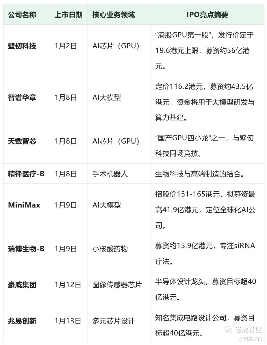 从1月2日至1月13日,以壁仞科技、智谱华章、天数智芯、MiniMax、豪威集团等为代表的公司,将以前所未有的密集节奏登陆港股,业务横跨AI芯片、大模型、半导体设计、生物医药等多个硬核科技领域。这场开年大戏,远非简单的资本扎堆,它深刻地揭示了在制度变革、产业进化和资本渴求三重推力下,中国科技企业的生存逻辑与香港资本市场转型的宏大叙事。