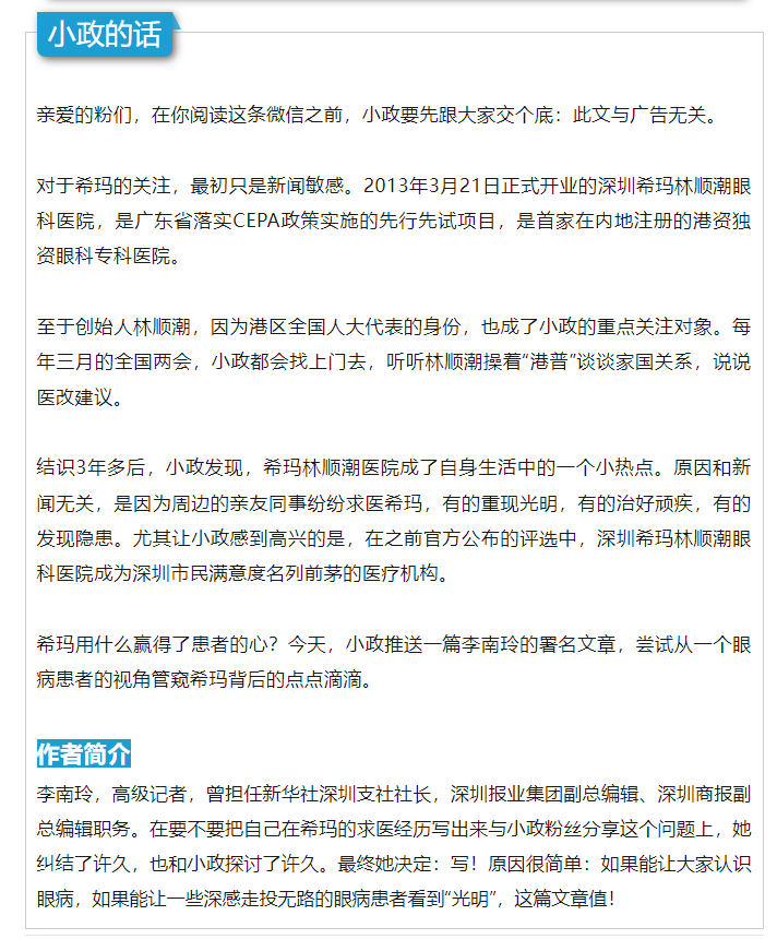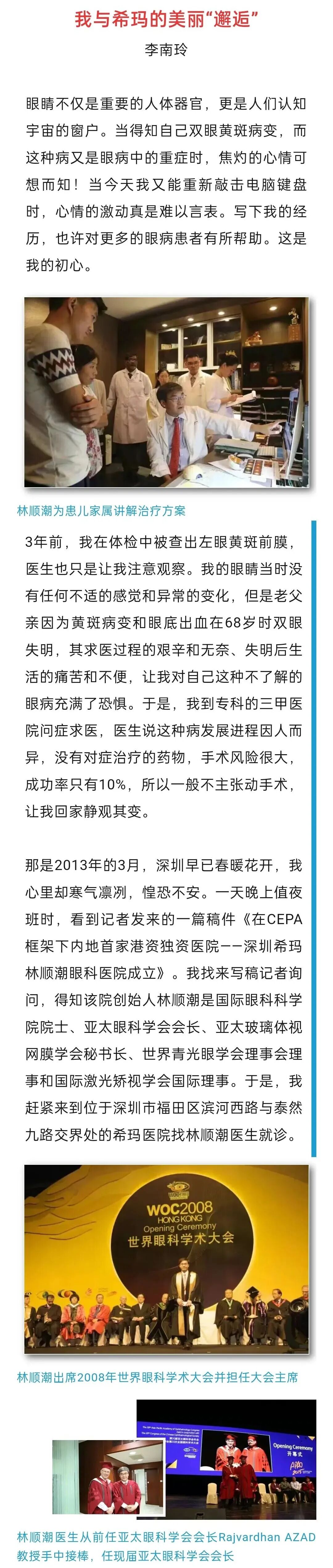 今天去复查眼睛,尼思特对我的检查结果的表述是“完美”。十年了,这双眼睛从险些失明到复明胜初,是林教授的精湛技艺,而这十年也是希玛的成长壮大阶段。回来翻出当年写的这篇文章,感慨万千。今天刚好是平安夜,我由衷的感谢林教授、感谢希玛,还有一路陪伴我的你们。把这篇文章转发给你,也算是我的圣诞礼物,祝希玛更快发展壮大,祝希玛人新年快乐,平安喜乐。from 李南玲
