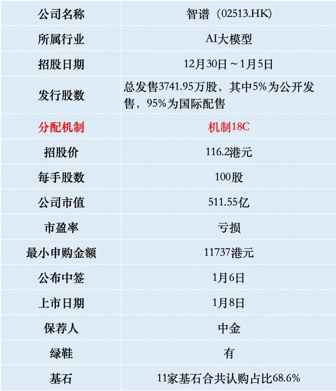 智谱本次IPO发行股份占全部股份比例的8.5%,按招股价116.2港元算,募资43.5亿港元,11名基石投资者锁定29.8亿,流通盘13.7亿。