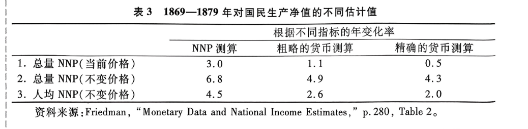经过调整之后,弗里德曼的结论是 (1)1867年至1879年,货币存量每年增长1.1%,(2)物价水平每年降低3.5%,由此看得出(3)货币流通速度是下降的。这个时期,产出的增长是最为主要的解释。