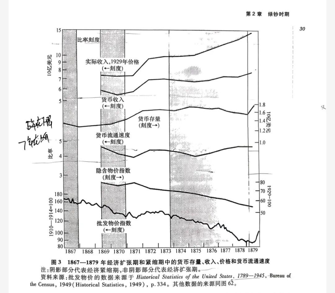 1873年至1879年美国出现了严重的经济衰退,也被美国经济学界认为是最长和最严重的衰退之一。弗里德曼强调(1)除了三次例外,所有货币存量的大幅下降都伴随着异常严重的经济衰退;(2)货币存量在经济周期谷底之前增长,在经济周期顶峰之前下降,在之后的实践中反复出现,另外,货币存量的谷底与经济周期的谷底偶有重合,比如1933年的大萧条;【马歇尔在《货币信用与商业》中就论述了信用与经济表现之间的关系,弗里德曼在这里算是进行了实证研究】;(3)1865年至1879年的14年间,批发物价平均每年下降6.5%,之后美国经济史上没有再出现过如此长跨度的物价持续下行。