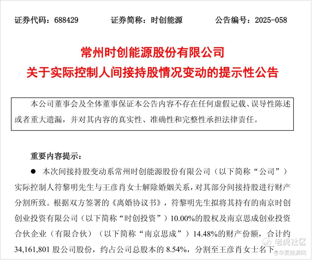 华夏能源网获悉,12月30日晚间,时创能源(SH:688429)公告称,公司实控人符黎明先生(董事长、法人代表)与王彦肖女士解除婚姻关系。财产分割后,王彦肖将间接持有时创能源约3416.18万股股份,约占时创能源总股本的8.54%。
