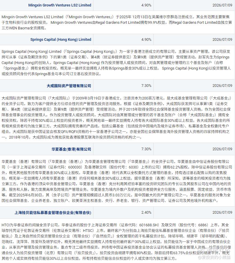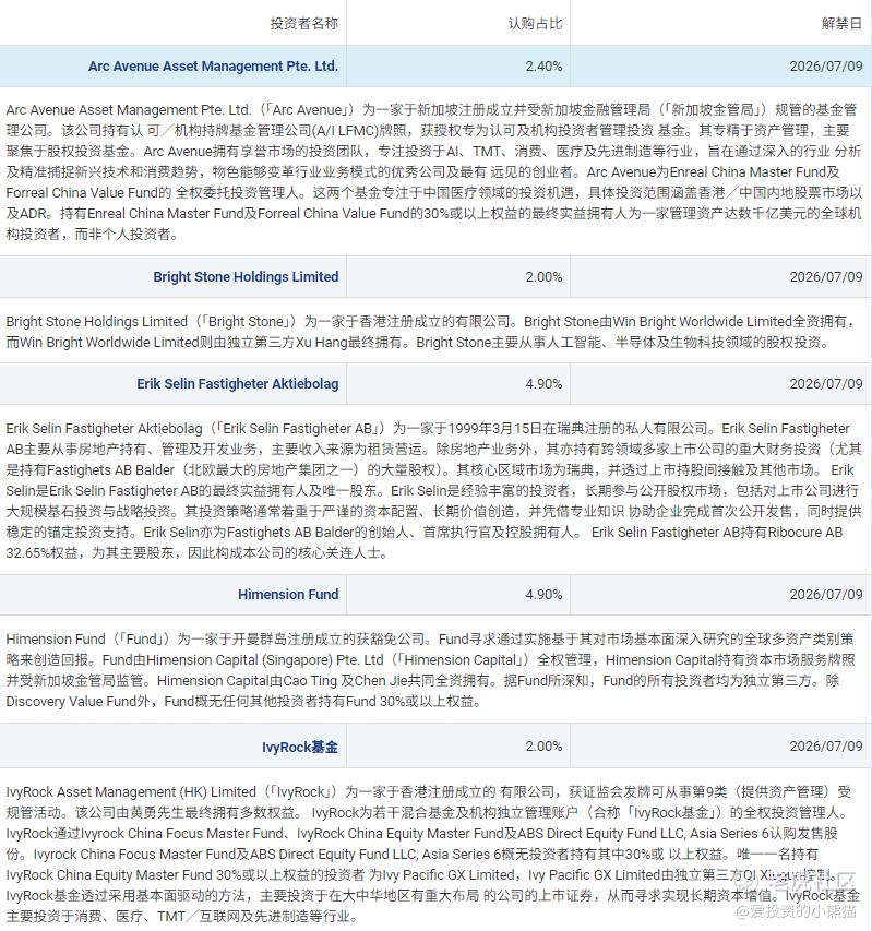 瑞博生物的基石投资者只有11家,认购占比48.90%。基石投资机构涵盖了新加坡、瑞典、中国香港及内地的专业资管机构、保险巨头和私募基金,背景各有侧重,具体如下: