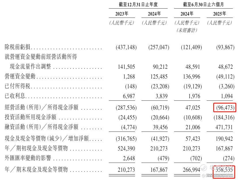 截至2025年6月30日,公司账上现金有人民币3.59亿元,经营活动现金流为-0.96亿元。
