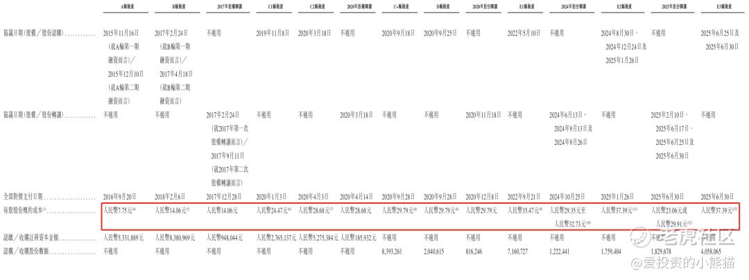 2. 每股成本:A轮7.75元,B轮与2017年股权激励均为14.06元,C1轮24.47元,C2轮与2020年股权激励均为28.68元,C+轮、D轮及2020年股份转让均为29.79元,E1轮35.47元,2024年股份转让29.35元至32.73元,E2轮、E3轮为37.39元,2025年股份转让则为23.06元或29.91元。
