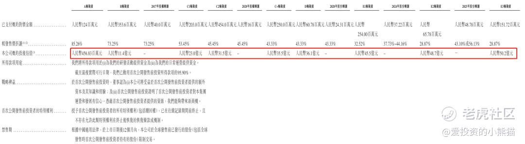 3. 投后估值:A轮4.57亿元,B轮11.4亿元,C1轮23.0亿元,C2轮31.5亿元,C+轮35.5亿元,D轮36.1亿元,E1轮45.5亿元,E2轮48.7亿元,E3轮50.2亿元。