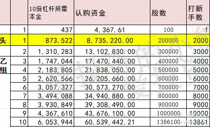 乙头需要认购资金874万,乙组的各档融资所需要的本金还有融资金额对应如下表: