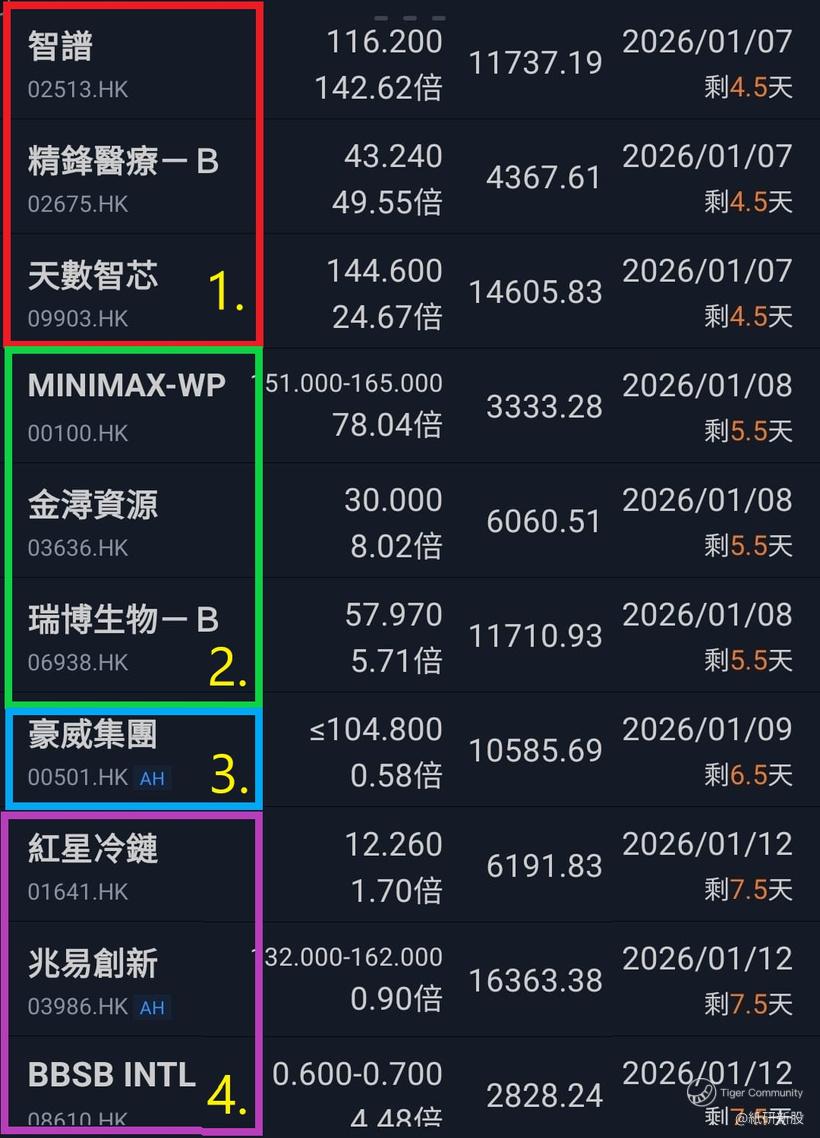 踏入新一月,已有10只新股正在招股,可以先看看下图,撞期的分别是1 & 2、2 & 3、3 & 4,但若果先剔除AH股下,我们可先忽略3,而4和1 & 2不撞期下,我们暂可放精力在1 & 2,事情便简单了不少