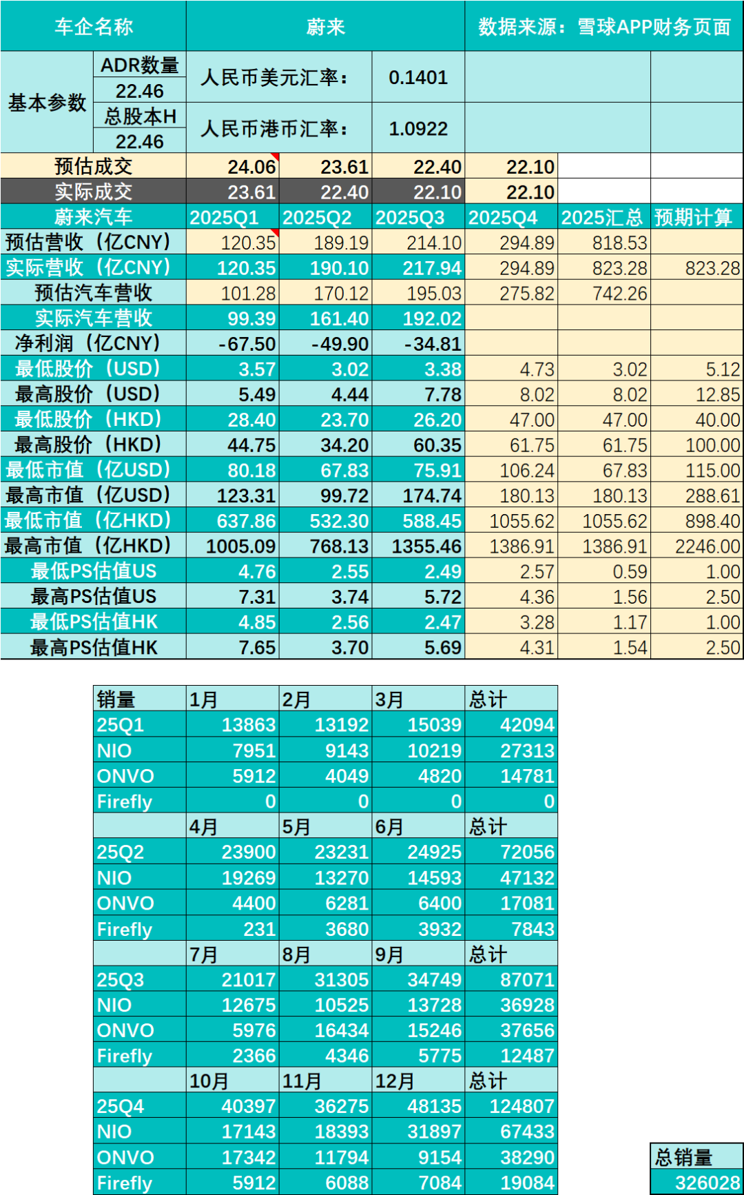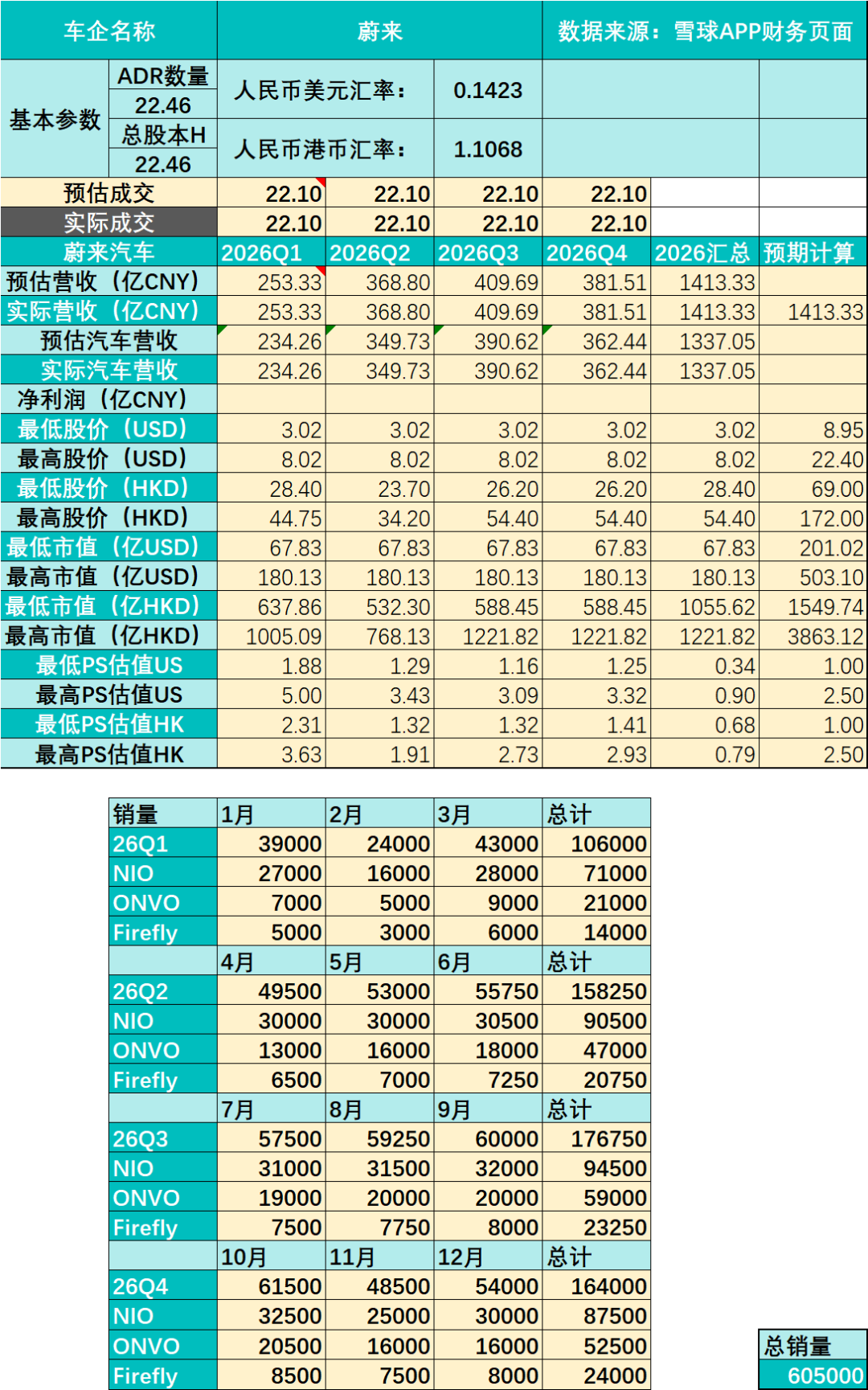 具体来说:2026年1月:ES8预计可以继续交付22000台左右,剩余5000台为其他车型。考虑到12月的表现,乐道订单可能没有那么多储备,所以按照7000算;萤火虫应该比较稳定一点,但也需要保守估计,给了5000台,7000应该有年底冲量的原因。2026年2月:预计春节要掉1/4产能和交付,所以预计为15000台ES8+1000台别的蔚来车型。乐道就直接参考去年年初的销量了。2026年3月:参考历史数据,略有反弹,基本正常化,考虑到乐道销量缺乏势能了,预测L80会在当月发布,并在月底抢交付2000台。因为3月份是最合理,最早的新车发布时机,更早要受到春节的影响。2026年4月:乐道L80开始上量交付,所以我预测为13000台左右。2026年5月:到这个时间点,ES8的订单量都是可以保证的。因为每个月交付2万台ES8的话,在叠加这五个月新增订单,到这个月订单应该有盈余,所以ES7的发布和交付可能不会像L80那么着急。这个月预测ES7可能会进行预热活动。L80继续交付上量。2026年6月:官方之前曾经提过计划是Q2发布新车型,所以6月份有可能是ES7的发布+交付。2026年7月:ES7会正式开始上量交付,L80稳定交付。2026年11月:保守预测这个月可能会出现补贴用尽的情况,所以要下调销量。2026年12月:月底会有冲刺,但考虑到补贴可能用尽,所以也仅仅是在11月的基础上略微上调。(注:ES9个人预计对整体销量影响比较小,所以没有专门做预测)基于以上预测的情况下,蔚来2026年年销量可以达到60万台以上,我猜蔚来有后续也可能会以这个数量级为目标。在这个交付量下,我相信蔚来是一定可以实现全年盈利的。目前市场对蔚来的估值,我个人判断应该是还没有更新,因为如果按照5美元的估值来反向推算,那么市场会认为蔚来2026年的交付量仍然保持在32-35万台,这是一个不太可能会发生的事情。
