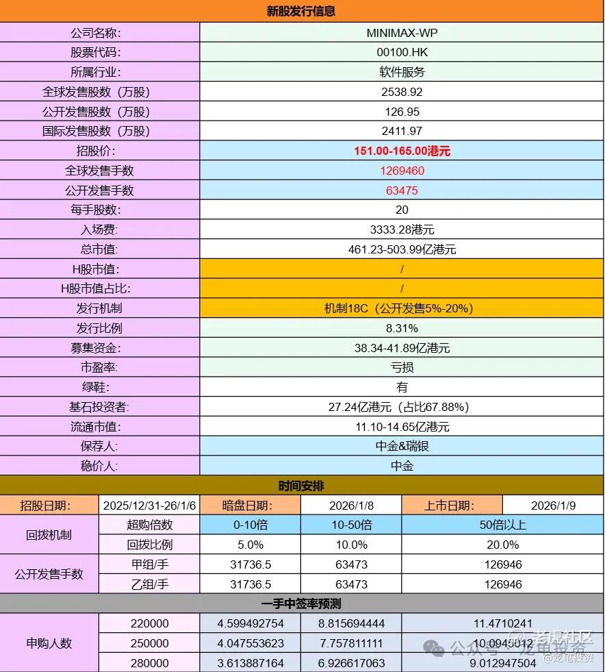 全球发售股数2538.92万股,每手20股,入场费3333.28港元,采用机制18C发行,截止发稿孖展倍数283.85倍,预计22-28万人参与,回拨20%,一手中签率10%左右,公司采用了阳光普照模式,见者有份,货量是智谱的三倍多,同样中签率亦是。