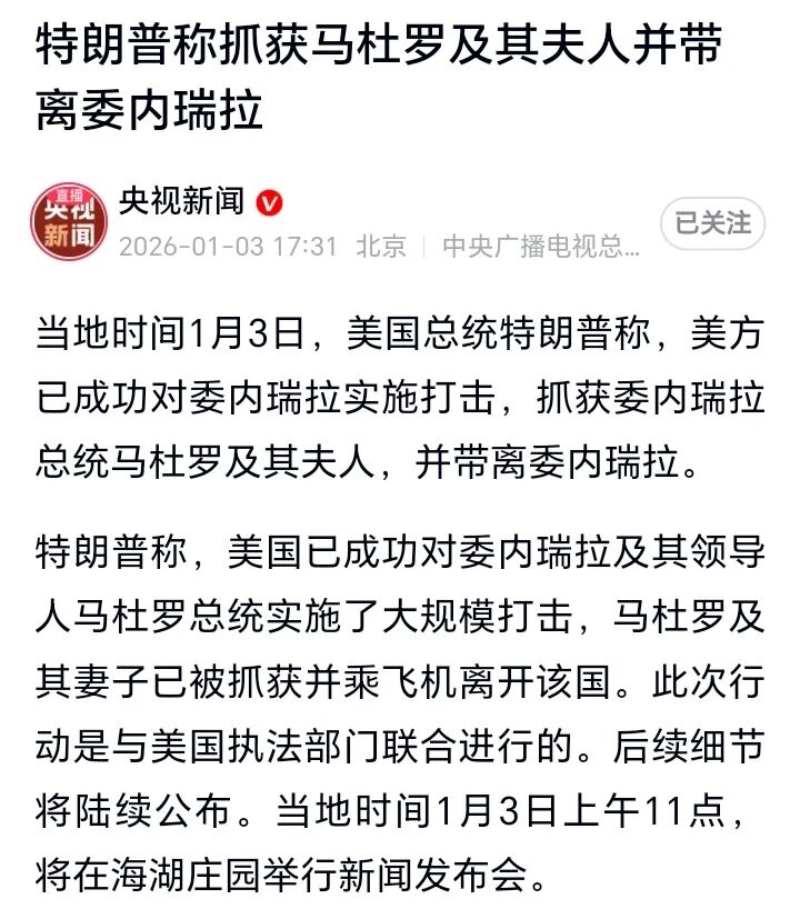 巧合的是,今天也是1月3日。总感觉美国抓走马杜罗的这个新闻不太真实。如果是真的,美军就创造了闪电战的新纪录。否则真要和委内瑞拉打持久战,就会打成俄乌冲突那样没完没了。