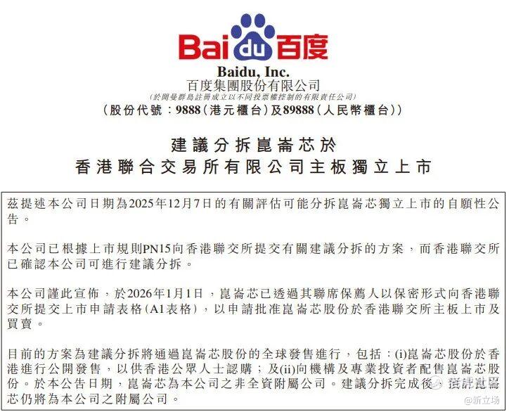 2026年1月1日,百度旗下AI芯片公司昆仑芯以保密形式向香港联交所递交上市申请。消息传出,市场反应迅速而直接:百度美股股价当日大涨15%,创下近期纪录。
