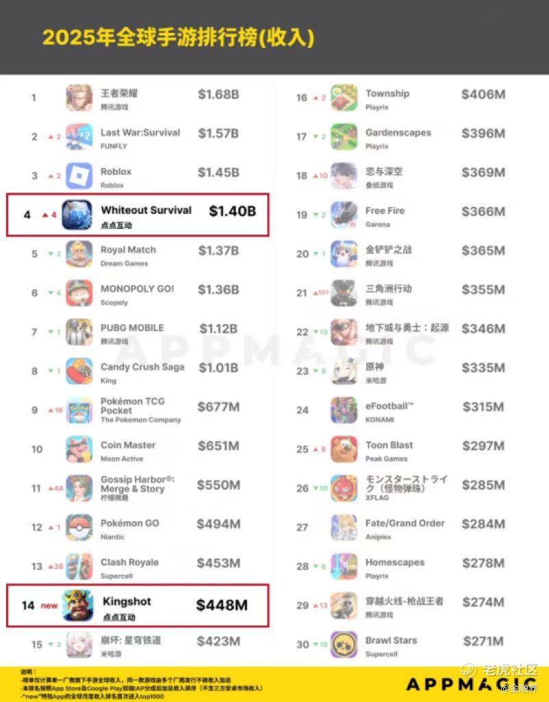 新年伊始,全球知名移动应用市场研究机构AppMagic正式公布了《2025年全球手游收入与下载排行榜》。世纪华通旗下多款产品表现抢眼,《Whiteout Survival》以年度约50%的强劲增幅成为10亿美元梯队的增长冠军,位列全球手游收入榜第四名;《Kingshot》则成功跻身年度收入榜第14位,成为2025年唯一上榜的新游,尽显企业在全球手游赛道的核心竞争力。