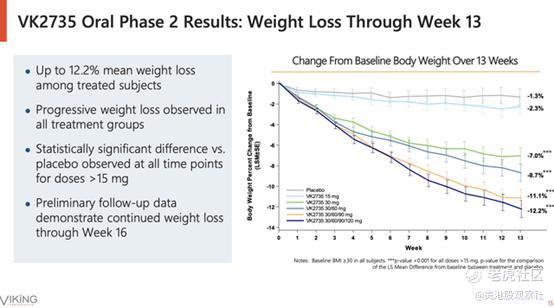 更令人振奋的是,Viking Therapeutics的VK2735口服候选药物顺利完成了II期临床试验。这家生物科技公司计划于2026年下半年启动该药物的III期临床试验。II期临床试验数据显示,在120毫克的最高剂量组中,受试者在13周的试验期内减重比例最高可达12.2%。