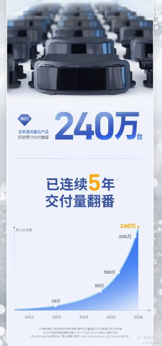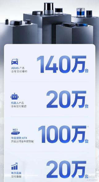 ADAS 产品全年交付量约 140 万台。机器人产品全年交付量超 20 万台。爆款产品 ATX 开启交付首年即突破 100 万台。单月最高交付量超 20 万台。全系激光雷达产品历史累计交付量已超 240 万台。已连续五年全年交付量翻番。