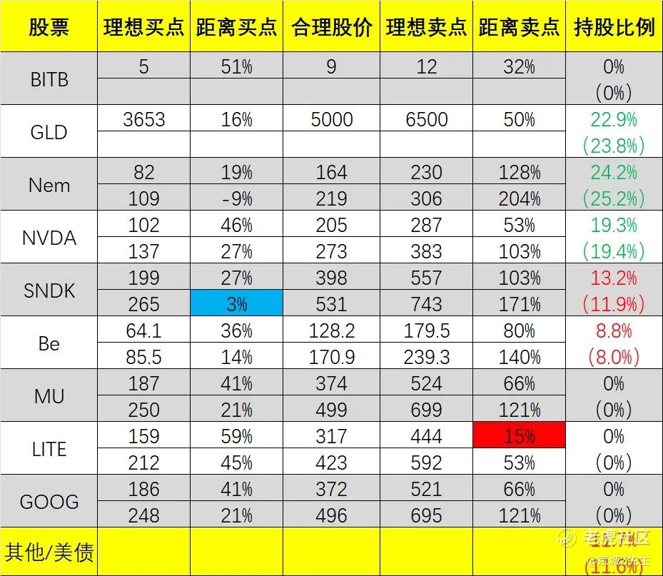NVDA 19.3%,SNDK 13.2%,NEM 24.2%,GLD 22.9%,BE 8.8%,现金/美债 11.7%。