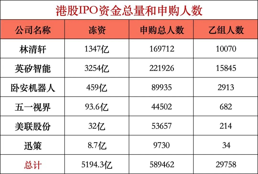 上一次6只新股撞车,共冻结资金5194亿港元,申购总人数达59万,但申购人数存在重复计算的问题。例如,同一投资者既可申购林清轩,也可申购英硅智能,还能申购卧安机器人,因此该数据参考价值有限。真正具有参考意义的是乙组申购人数,因为乙组需占用大额资金,导致许多投资者申购了林清轩后便无余力申购英硅智能。