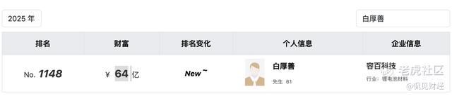 根据股权穿透,白厚善合计持有容百科技25.77%的股权,以最新收盘价格计算,该部分持股市值约为65亿元。根据2025年胡润百富榜,白厚善以64亿财富,位列榜单第1148位。