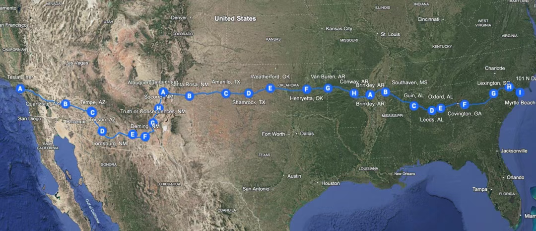 David Moss从加州的特斯拉餐厅出发,抵达南卡罗来纳州的默特尔海滩,行程耗时2天又20个小时,行驶了2732.4英里(约4397公里),没有进行任何人工接管,在特斯拉超充站里的停车也没有干预。