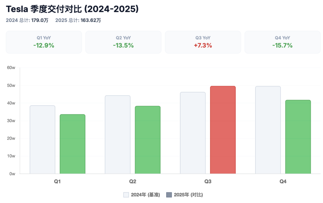 从2025年全年来看,特斯拉全球累计交付163.61万辆(包括交付158.53万辆Model Y和Model 3)新车,和2024年的178.9万辆下滑幅度达8.6%。