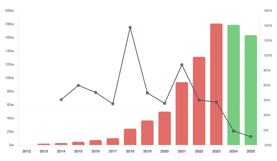 ◎ 欧洲市场之前从36.5万(2023年),下降到32.5万(2024年)然后今年直接下降到23.6万台(2025年估计)。