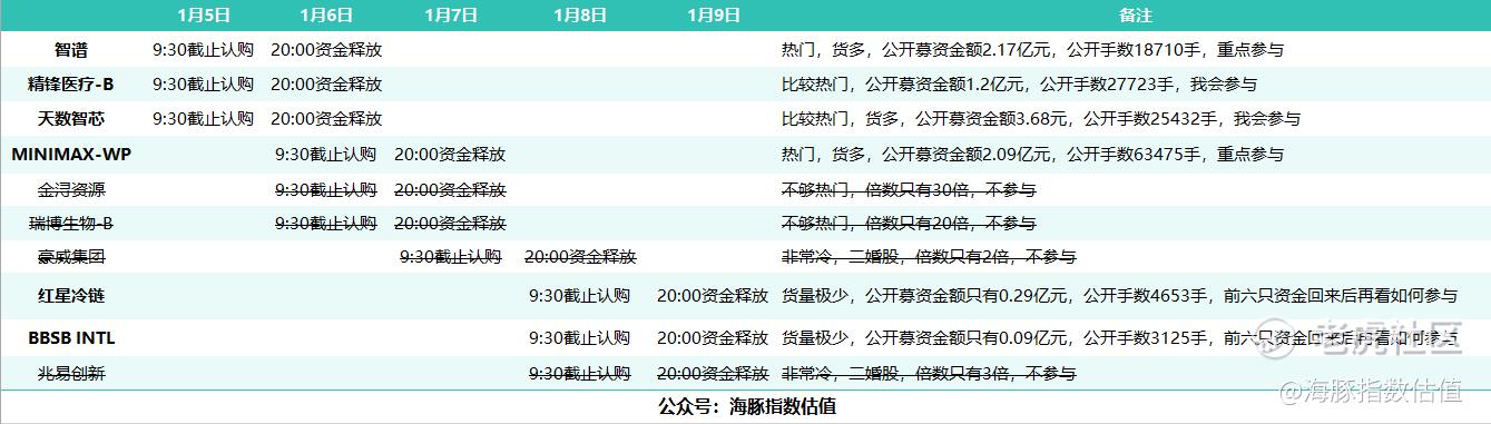 等智谱、MINIMAX、精锋医疗-B、天数智芯资金释放后,再参与红星冷链、BBSB INTL。智谱、精锋医疗-B、天数智芯明早就截止认购了,大家别忘了。