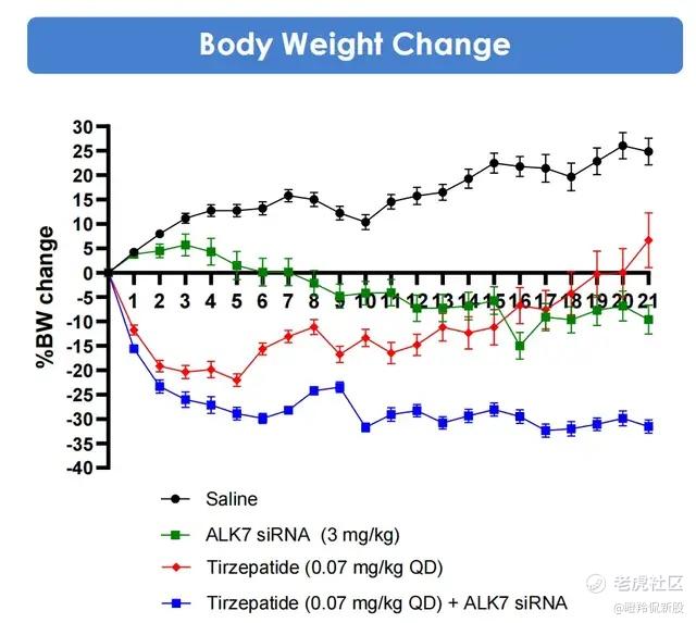 以及在饮食诱导的DIO小鼠模型中,ARO-ALK7单药和联用替尔泊肽均展现了出色的体重减轻疗效。