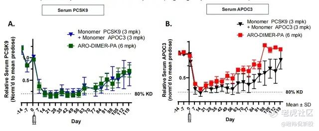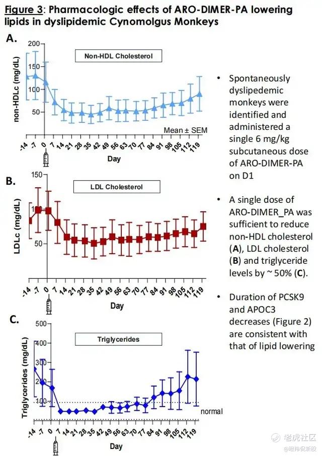 同样,在药理模型中ARO - DIMER - PA的TG反弹趋势也是从接近第90天左右开始抬头,很快恢复到注射前的水平。不知道在人体上能否通过提升剂量并平衡安全性来维持更长时间的APOC3降解水平,从而实现更长的给药周期。