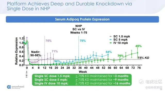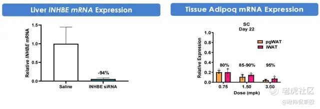 ARO-INHBE的临床前研究展现更为详细,在饮食诱导的肥胖(DIO)模型中观察到肝脏INHBE mRNA表达降低94%的水平;其次小鼠模型在皮下注射给药后三周,各剂量下两种不同脂肪组织中Adipoq mRNA表达敲低均达到≥ 80%。