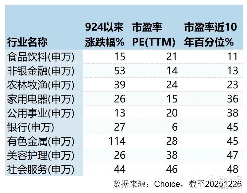 去年“924”以来,在32个申万一级行业中,有4个行业指数涨幅翻倍;与此同时,银行、房地产、石油石化、食品饮料、公用事业和煤炭等行业的涨幅却非常有限,不是常常有网友吐槽嘛——“我在白酒里躲牛市”。