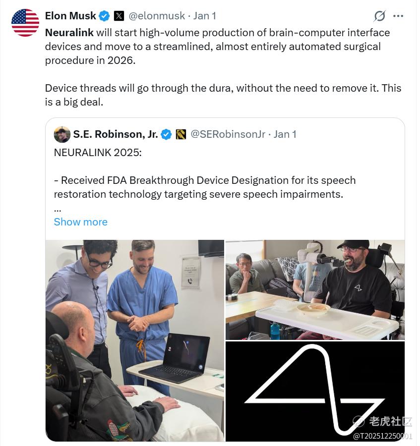 触发此轮行情的直接导火索是Neuralink的最新动态。当地时间1月1日,马斯克在社交媒体宣布,Neuralink将于2026年启动脑机接口设备的大规模生产,并推进几乎完全自动化的手术方案。与此同时,OpenAI首席执行官Sam Altman支持的Merge Labs正分拆独立,主攻利用超声波读取脑部活动的新技术路线。两大科技巨头的动作表明,脑机接口正从单一的科学实验走向多元化的商业竞速。
